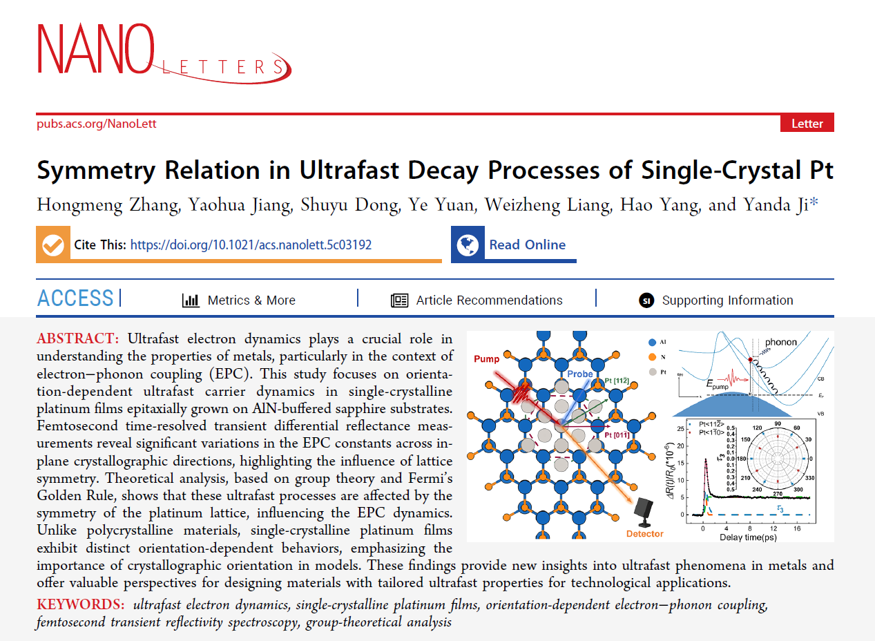 近日,物理学院杨浩教授团队在金属超快动力学与电子–声子耦合(EPC)研究方面取得新进展。相关成果以《Symmetry Relation in Ultrafast Decay Processes of Single-Crystal Pt》为题,被国际期刊《Nano Letters》接收发表。吉彦达副教授为论文通讯作者,南航物理学院博士生张泓萌为第一作者。