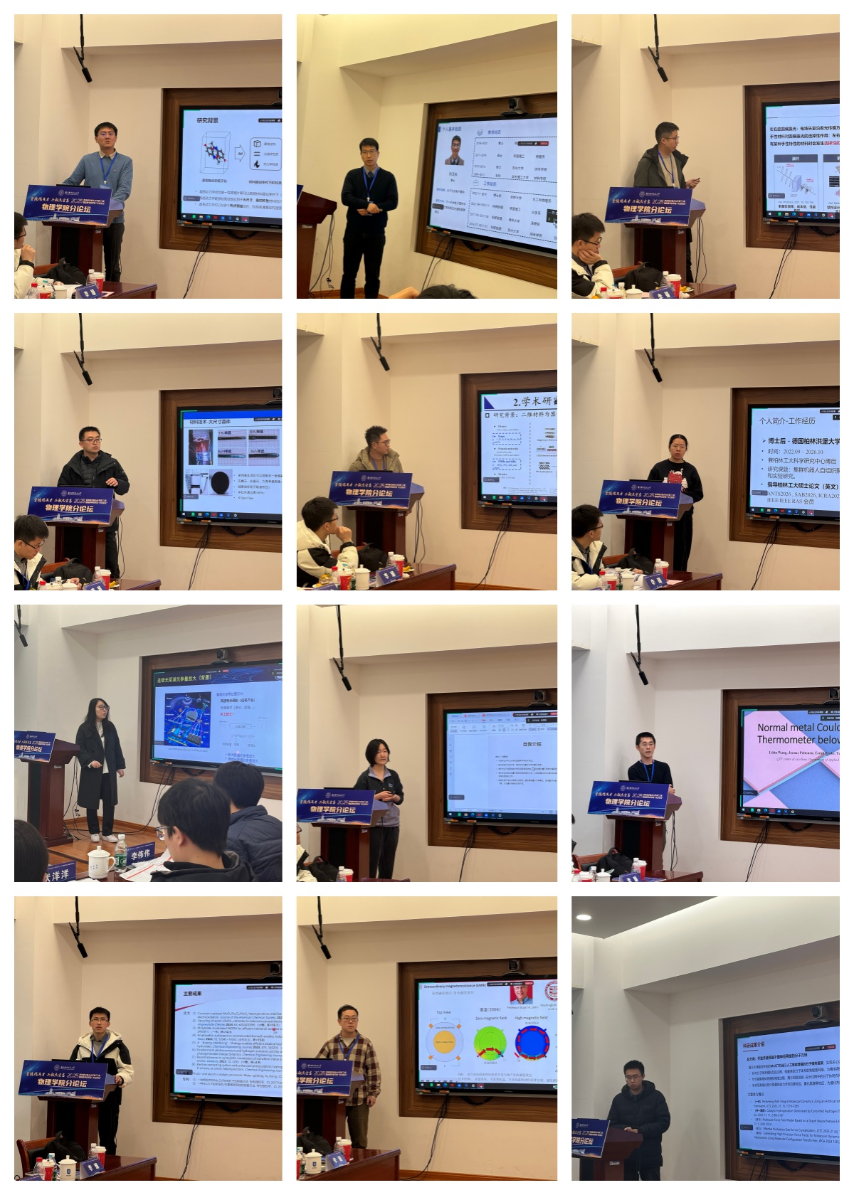 随后,24位参会学者围绕物理学前沿问题分享最新研究进展,报告覆盖微纳结构与波动调控、精密测量与物理应用、低维材料与器件、光与物质相互作用、新型功能材料与光电器件、复杂体系中的输运与调控等方向,既体现了前沿基础问题的深入探索,也展示了面向关键器件与应用场景的研究路径。与会教师与学者围绕研究思路、关键技术路线及未来发展趋势展开了充分交流,现场研讨氛围热烈。